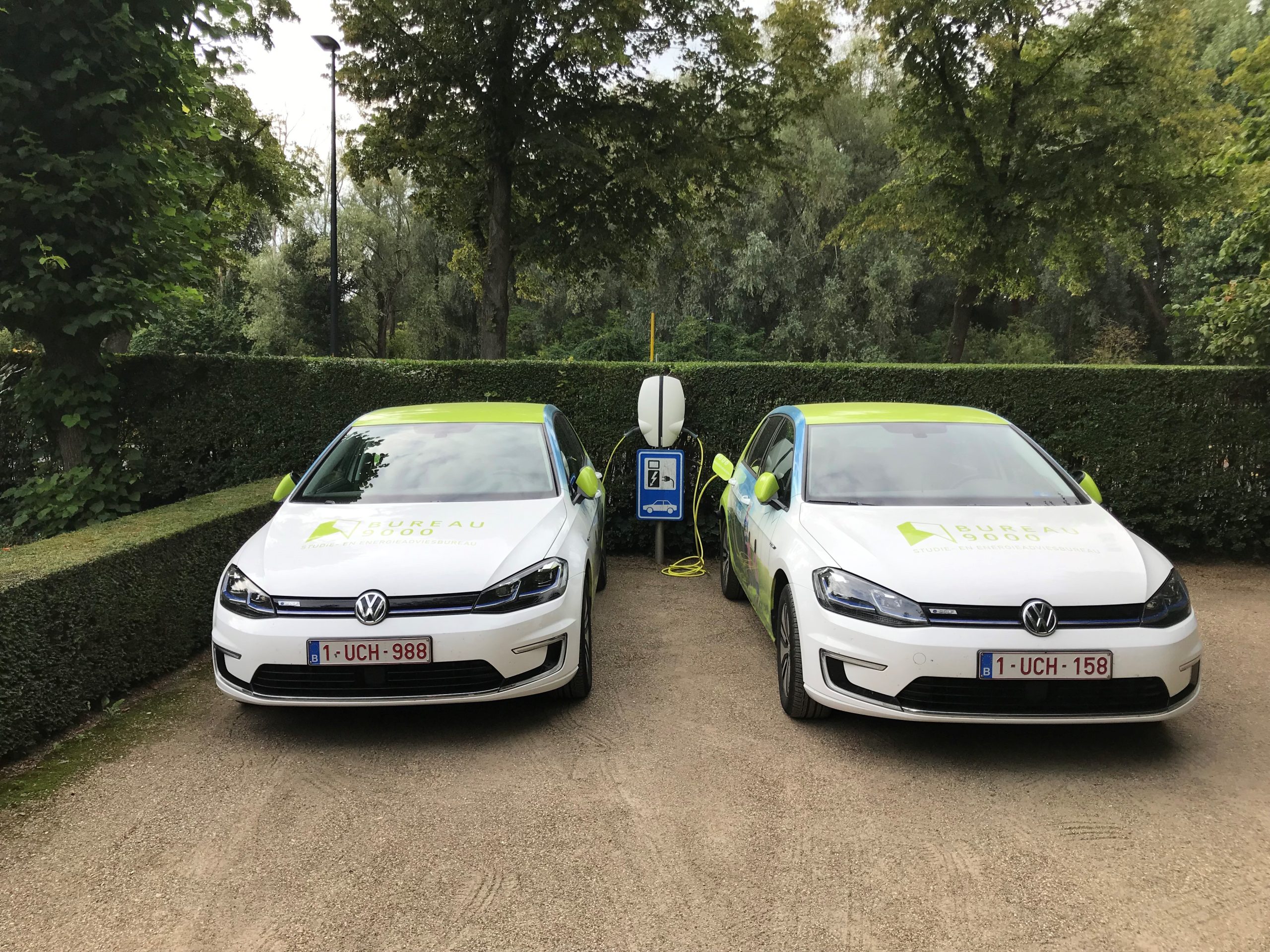 Heel wat verplaatsingen moeten met de wagen gebeuren omdat het openbaar vervoer niet zover reikt of niet snel genoeg is. We voorzien daarvoor elektrische wagens en laden die op met groene stroom van Ecopower. Deze elektriciteitsleverancier produceert zelf 100 % duurzame wind- en zonne-energie en voorziet trouwens niet alleen de wagens, maar het hele Bureau 9000-kantoor van elektriciteit uit hernieuwbare energiebronnen.